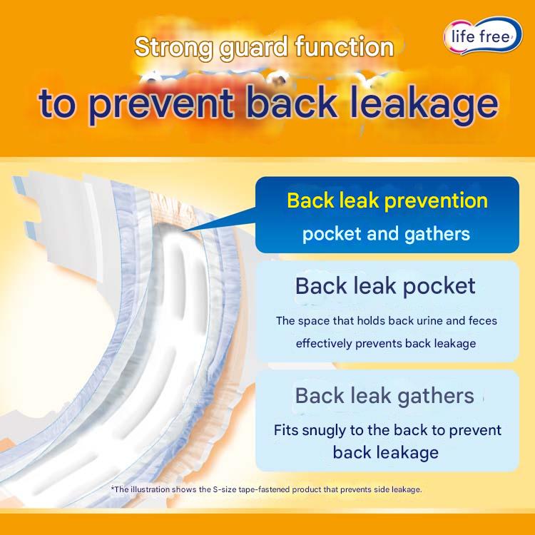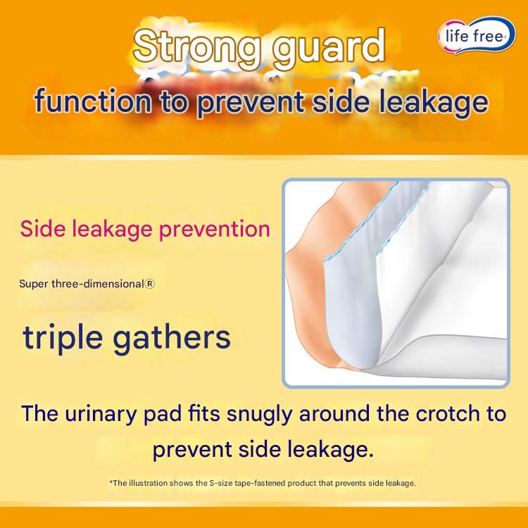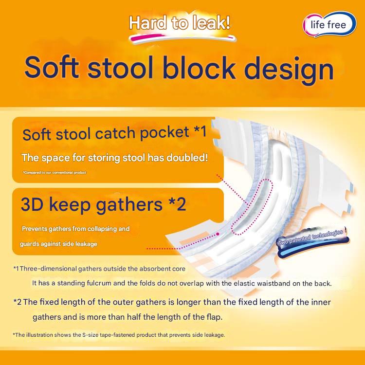 This is a tape-type diaper designed with three-dimensional triple gathers that fit snugly around the thighs to prevent side leaks.