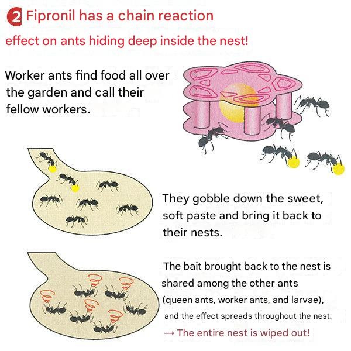 The bait is then shared with nestmates (queen, worker ants, larvae), allowing the insecticide to spread throughout the colony. → Nest-wide extermination!